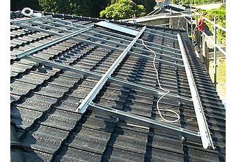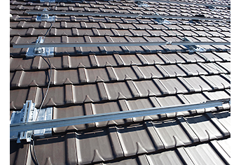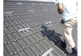 粘土瓦やセメント瓦の屋根にも設置できる工法です。瓦に穴を開けてH支持金具を取り付け設置します。