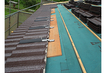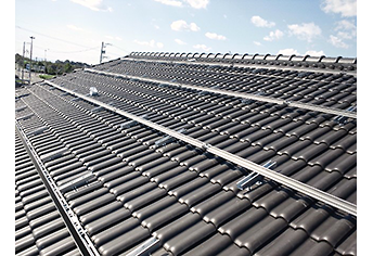 粘土瓦(和瓦、平瓦、S瓦等)の屋根に設置する工法です。瓦の上下に支持金具を取り付けて設置します。セメント瓦には使用できません。