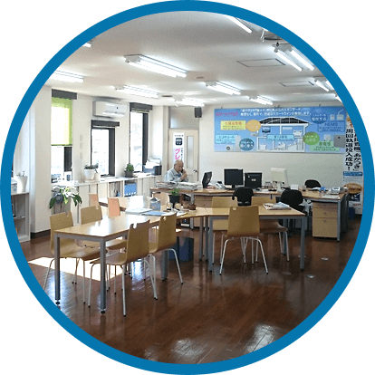 ソーラーパークの西側に池戸電気の社屋があります。1階の正面玄関を開けるとショールームがございますので見学希望の方はこちらまでお越しください。